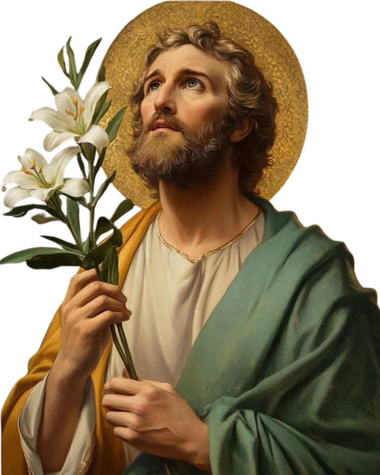 Der Retter ruhte in deinen Armen und wuchs unter deinem Blick. Du bist gesegnet unter allen Menschen, und Jesus, das göttliche Kind deiner jungfräulichen Gattin, ist gesegnet. Heiliger Joseph, als Vater dem Sohn Gottes gegeben, bitte für uns in unseren Sorgen um Familie, Gesundheit und Arbeit bis an unser Lebensende, und erbarme dich unser zur Stunde unseres Todes.